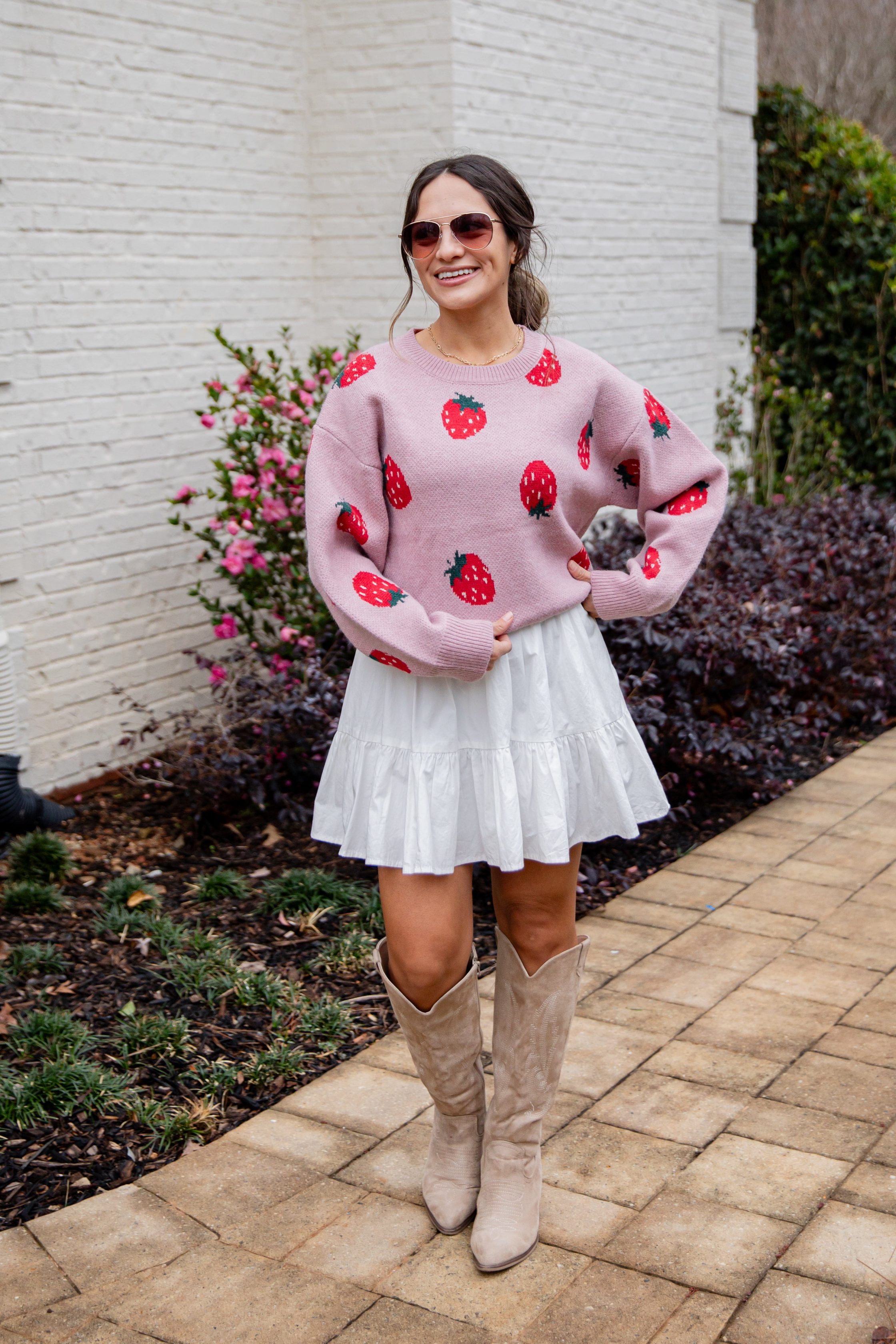 The Berry Bliss Blush Knit Sweater brings a playful pop to your everyday knitwear. Designed with an all-over strawberry print. this sweater features a soft. cozy knit feel with a relaxed fit that’s easy to wear all day long. The classic crew neckline keeps it timeless. while the charming pattern adds a fun. feel-good touch. Pair it with denim. trousers. or a skirt for a look that’s effortlessly cute and comfortably styled.