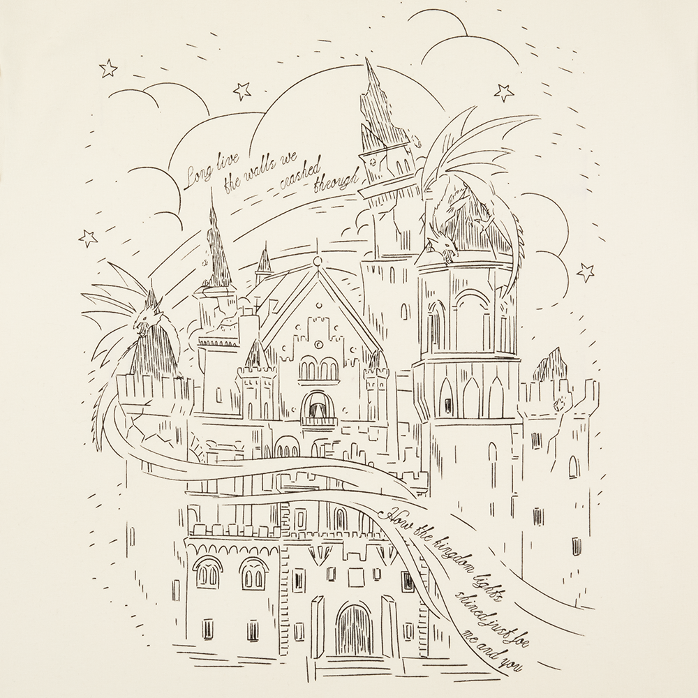 Cream baby t-shirt featuring castle design and Long live the walls we crashed through. How the kingdom lights shined just for me and you song lyrics printed on front.