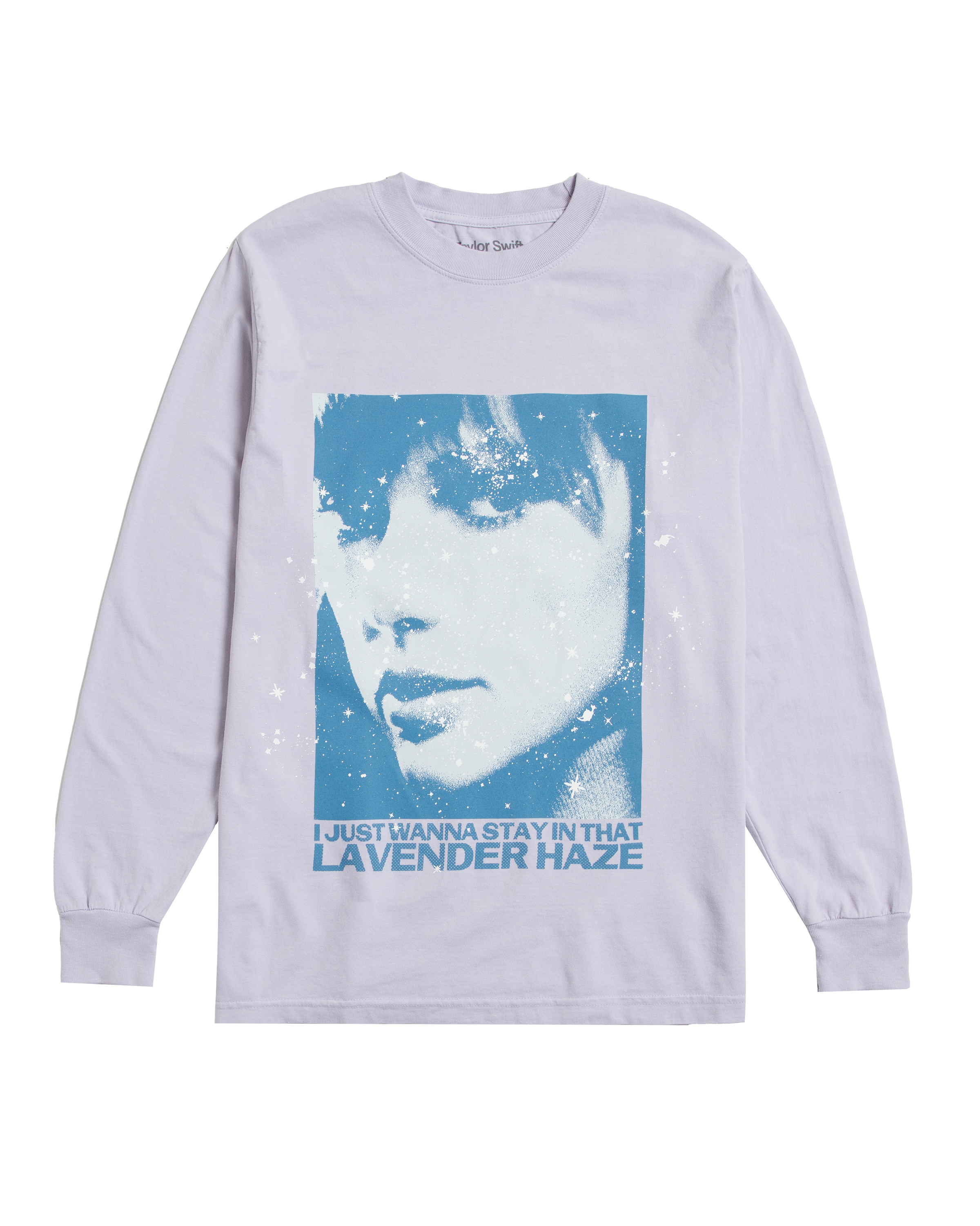 Lavender long sleeve t-shirt featuring Taylor Swift Midnights album artwork and I just wanna stay in that lavender haze song lyrics and twinkle design printed on front.