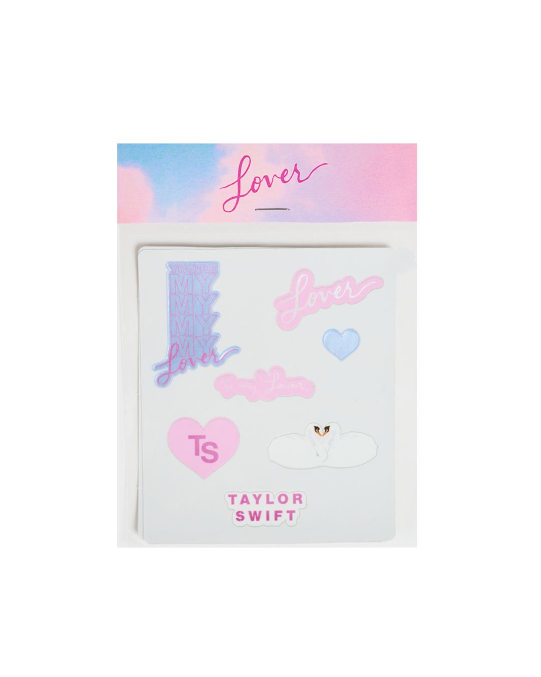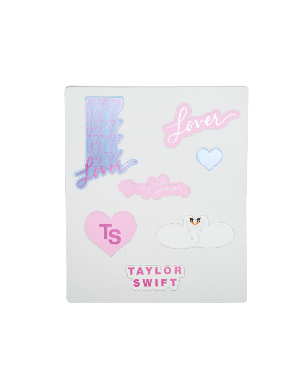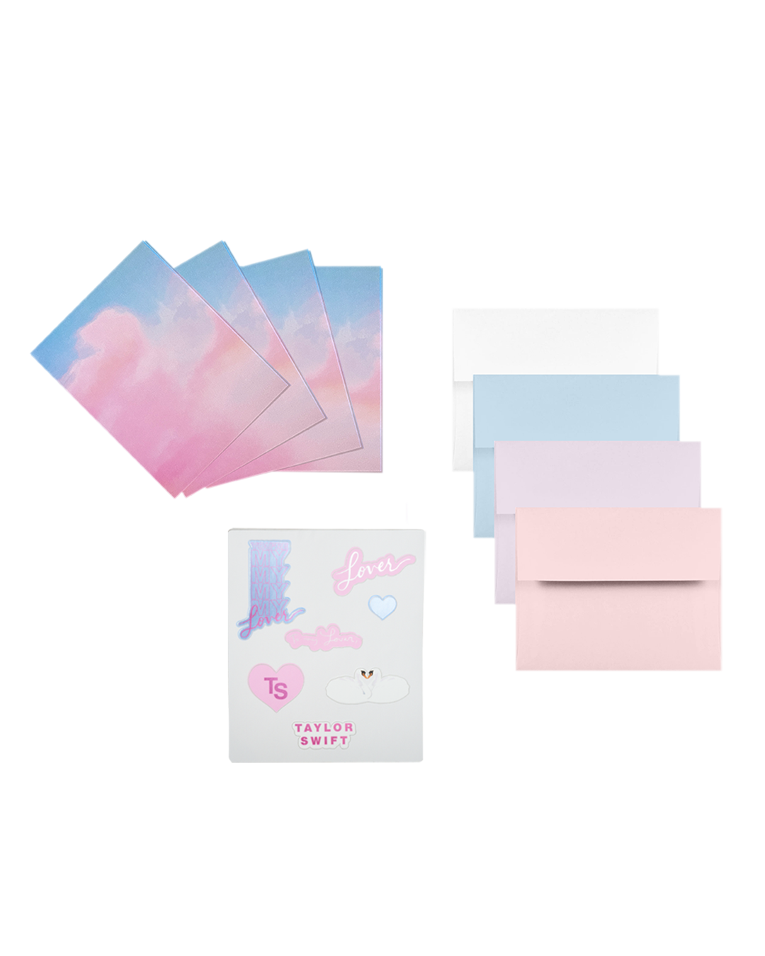 Set of 4 customizable greeting cards with Lover album cloud print on inside and outside with blue. beige and pink envelopes. Sticker set included featuring Taylor Swift logo. Lover album logo. TS logo. You’re My My My My Lover song lyrics. To my lover song lyrics. heart and swans individual patches.