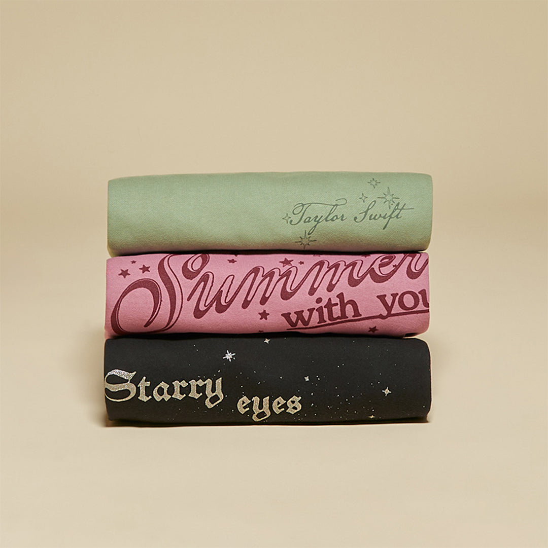 Black crewneck featuring Starry eyes sparking up my darkest night song lyrics with star glitter design printed on front with moon phase designs and Call It What You Want song lyrics glitter printed down wearer’s right sleeve with moon and star glitter design printed down wearer’s left sleeve and Taylor Swift in glitter printed vertically with star design on back.