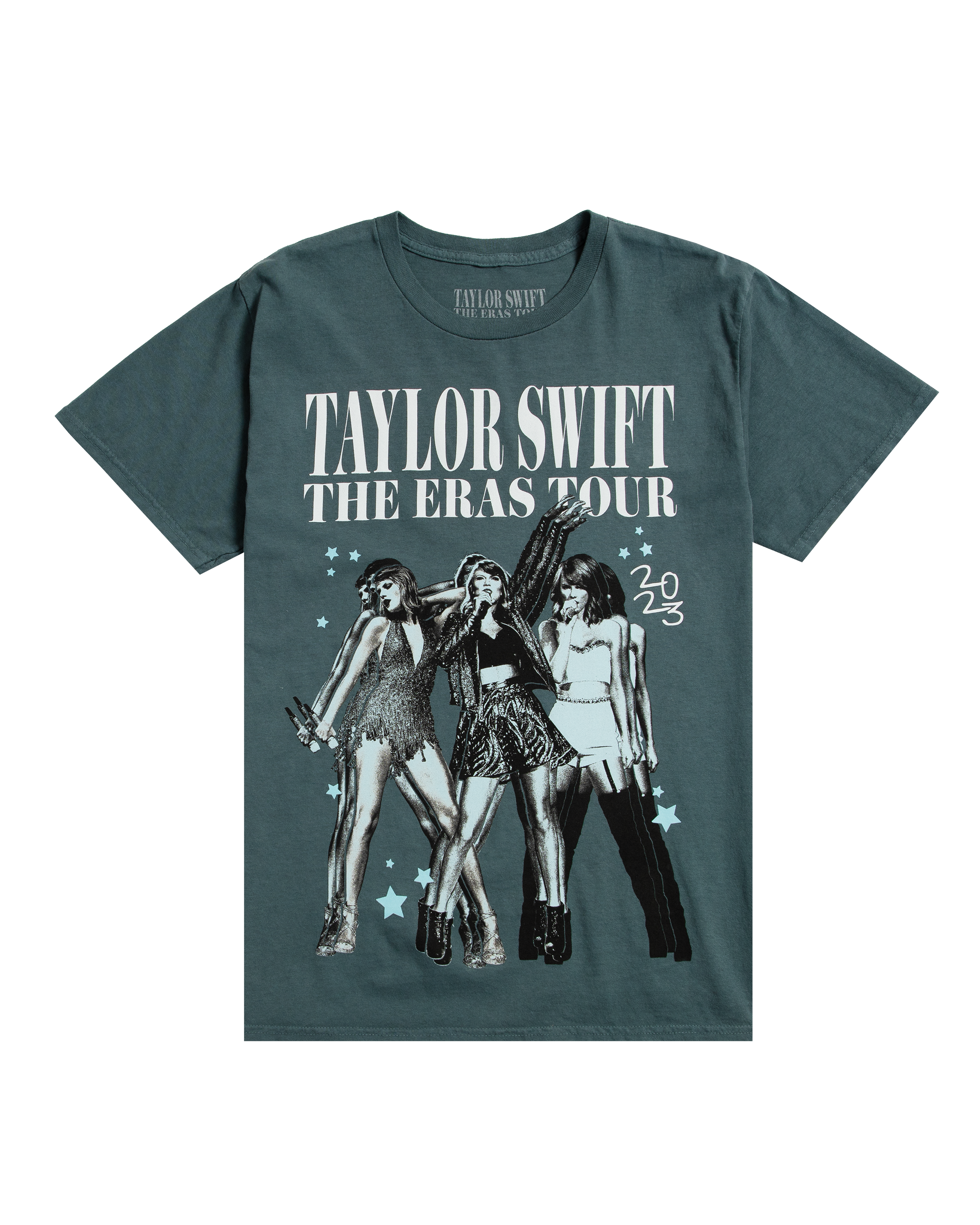 Blue t-shirt with 1989 album era photos of Taylor Swift and Taylor Swift | The Eras Tour printed on front with Taylor Swift | The Eras Tour. tour locations. 2023. and 1989 album era photos of Taylor Swift printed on back.