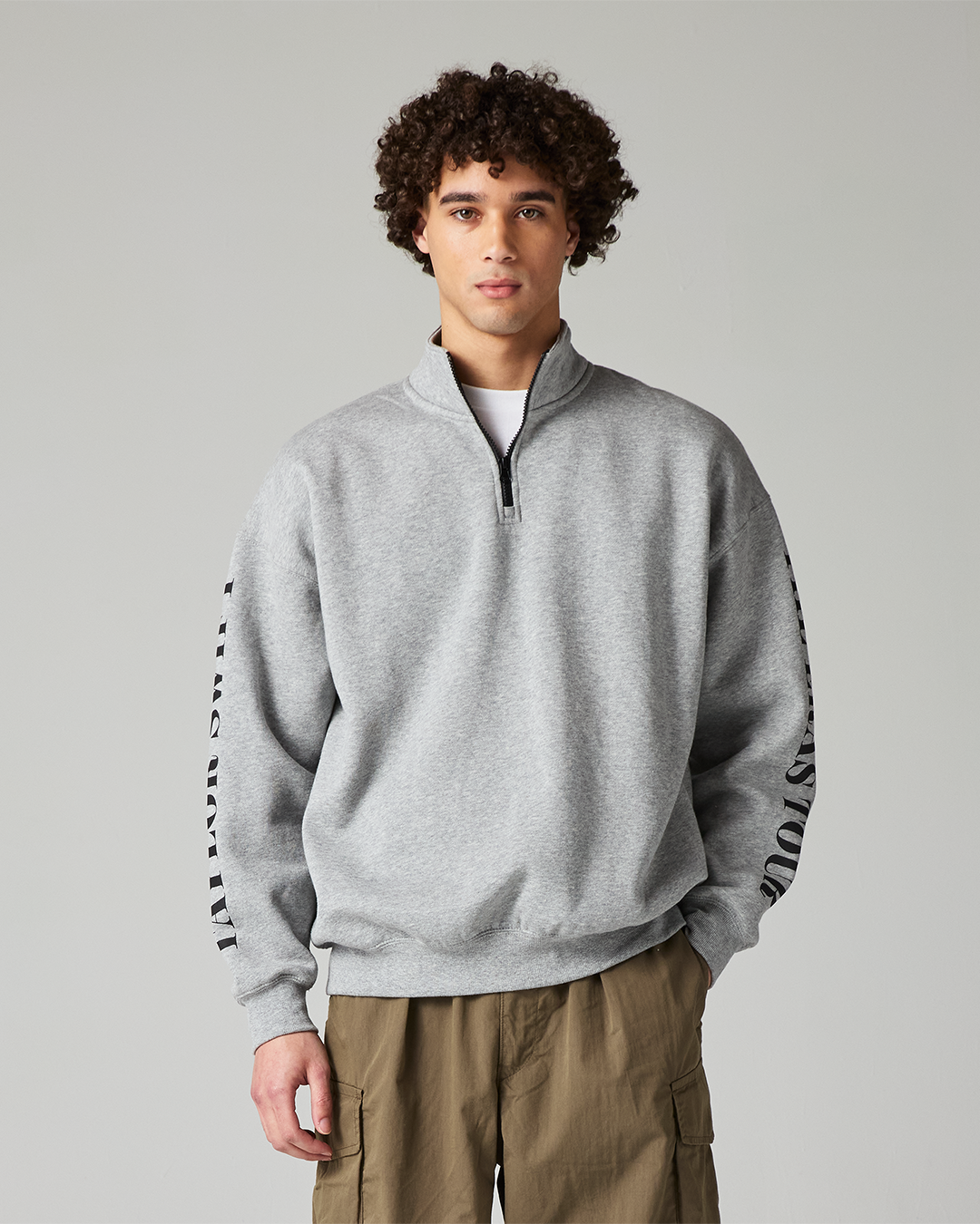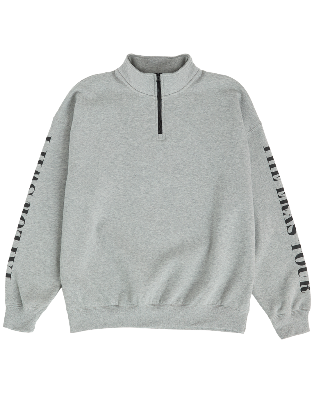 Gray quarter zip sweatshirt featuring Taylor Swift printed on wearer’s right sleeve and The Eras Tour printed on wearer’s left sleeve with photos of Taylor Swift printed on back.