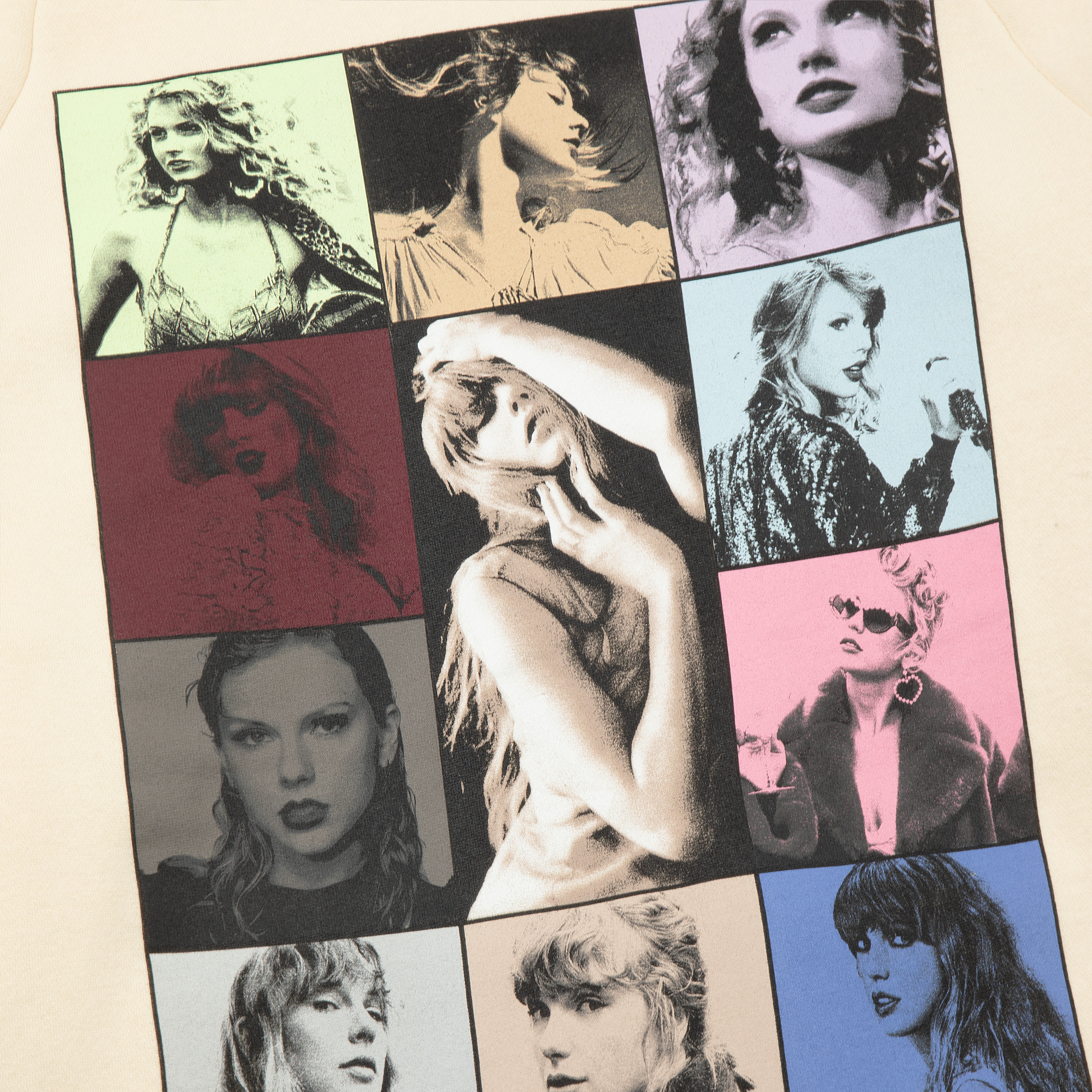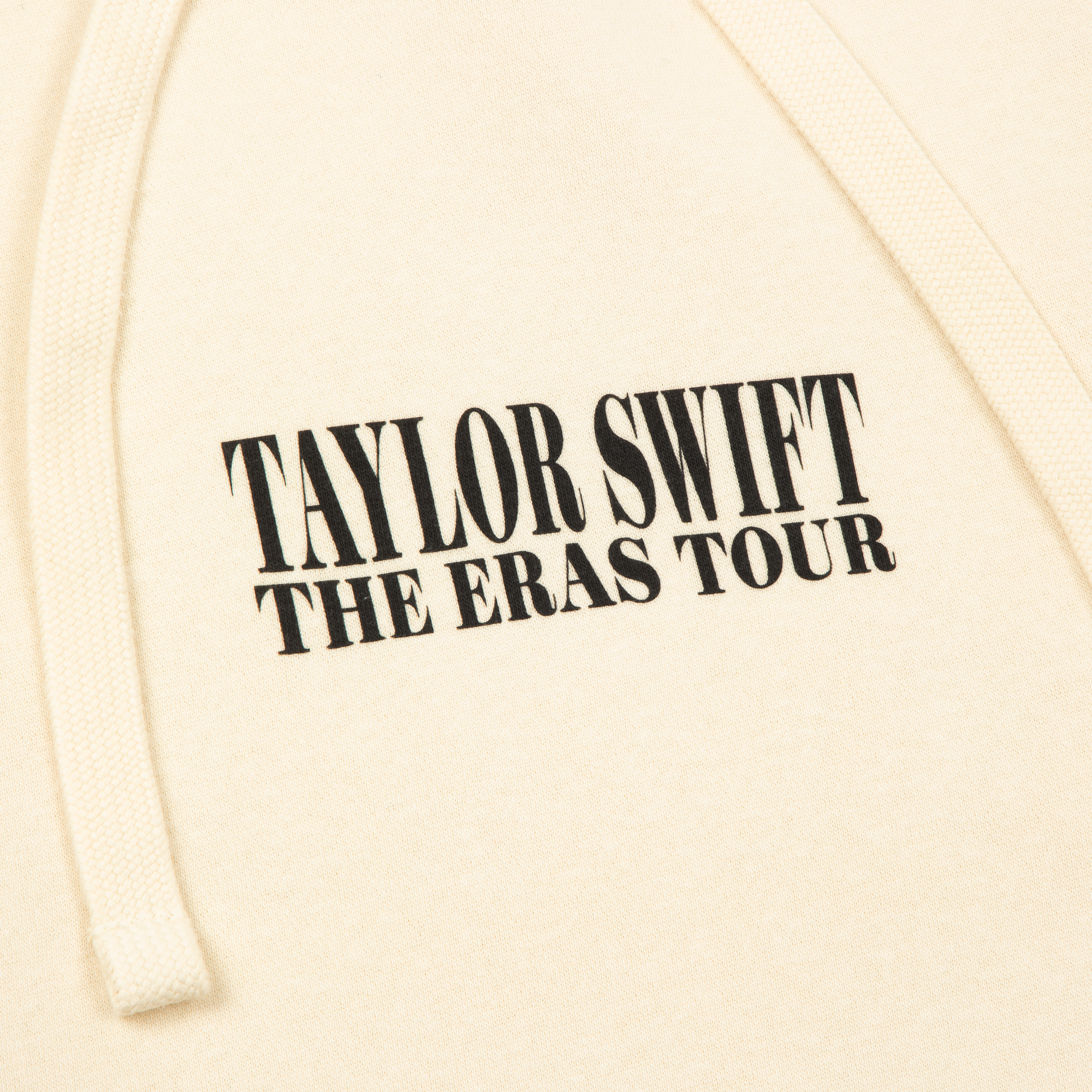 Beige hoodie with front pocket featuring Taylor Swift The Eras Tour printed on front with photos of Taylor Swift printed on back.