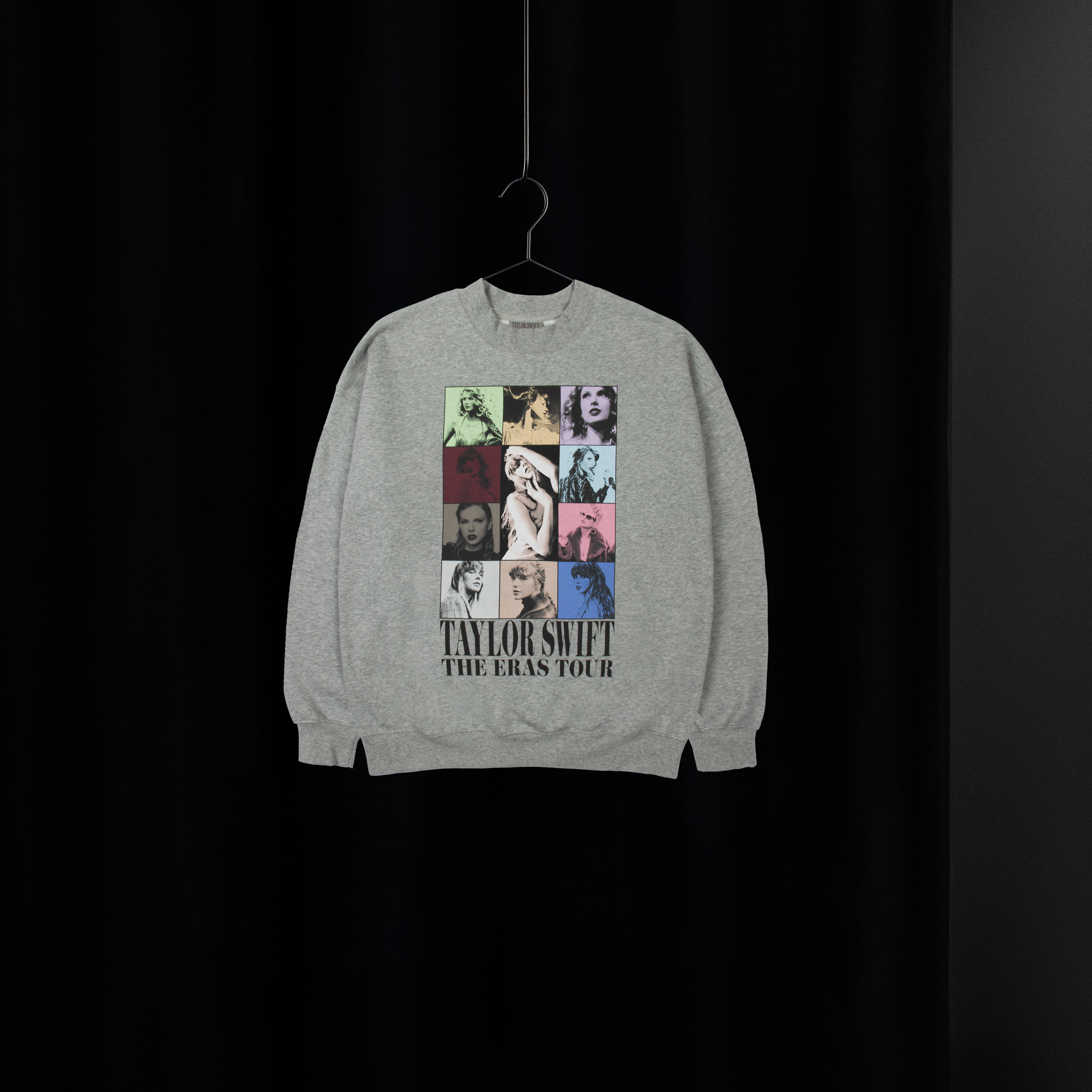 Gray crewneck featuring photos of Taylor Swift and Taylor Swift The Eras Tour printed on front.