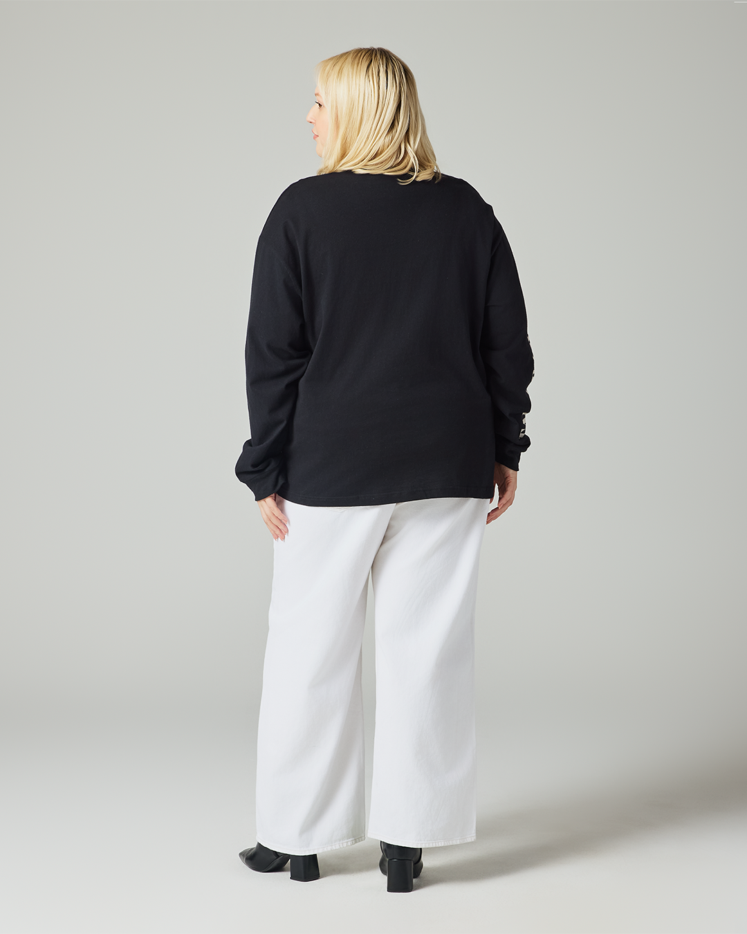 Black long sleeve t-shirt featuring Taylor Swift The Eras Tour printed on wearer’s right sleeve and photo of Taylor Swift printed on front.