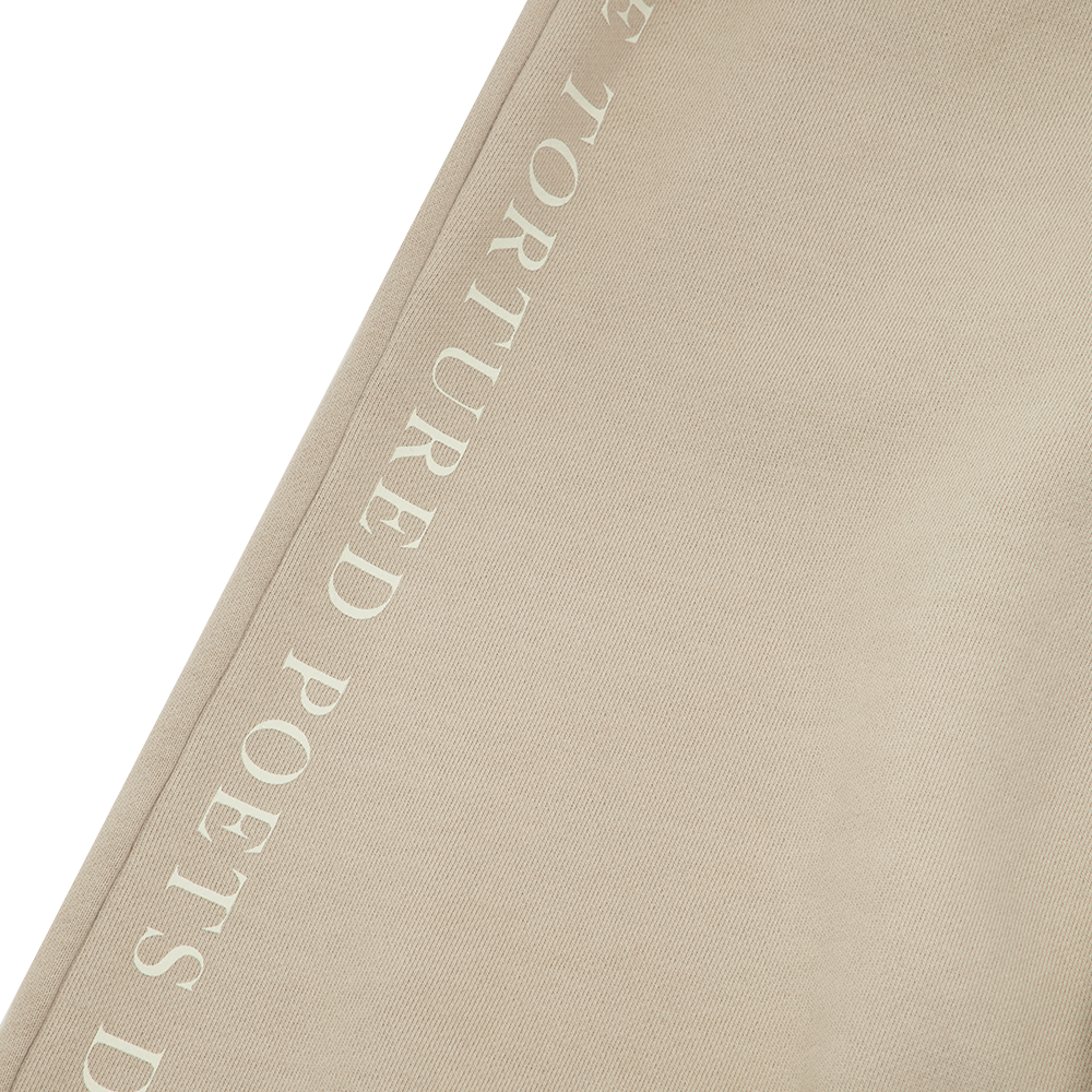 Parchment beige sweatpants featuring TTPD album logo printed on wearer’s left leg and The Tortured Poets Department printed down wearer’s right leg. Drawstring waist and side pockets.