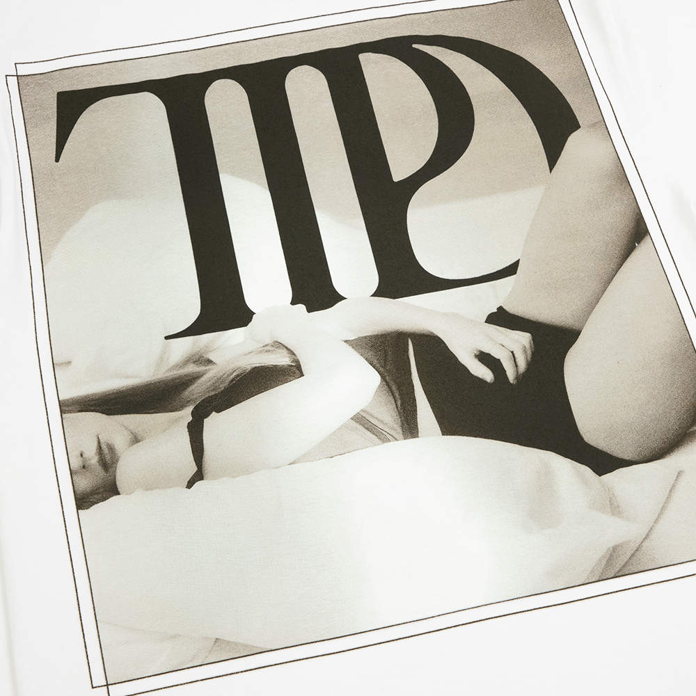 White t-shirt featuring TTPD album logo and The Tortured Poets Department printed on front left chest with photo of Taylor Swift and TTPD album logo printed on back.