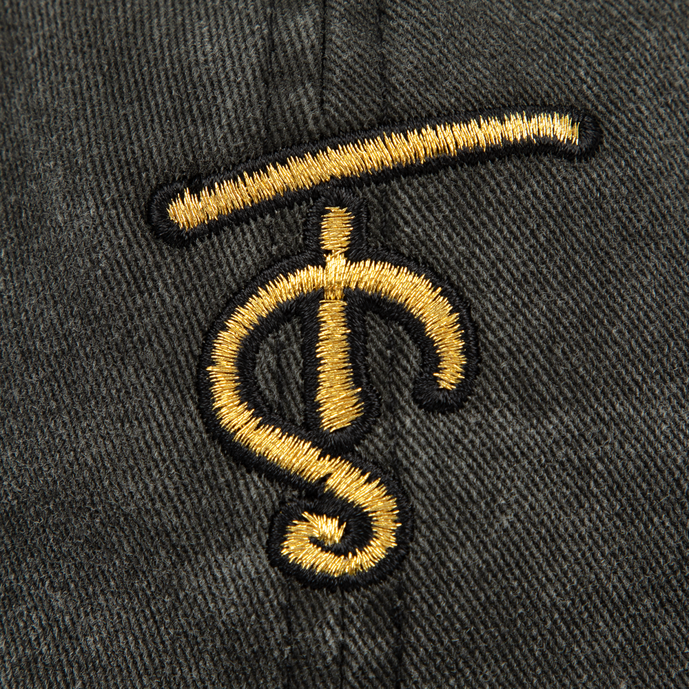 Washed black dad hat with TS embroidered on front in metallic thread with adjustable back closure.
